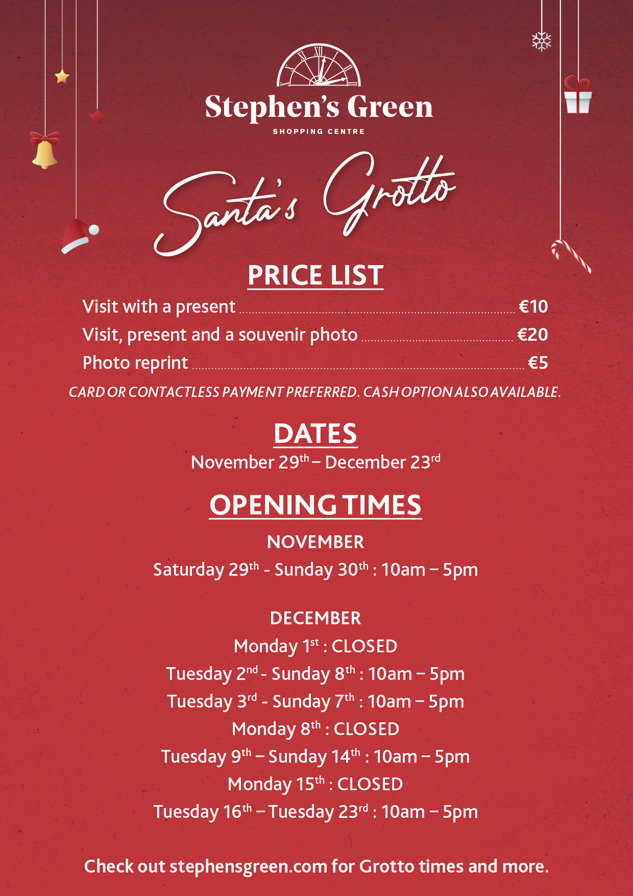 Santa is in his Grotto on the top floor November 29th – December 23rd. Check out the ticketing and pricing information below.